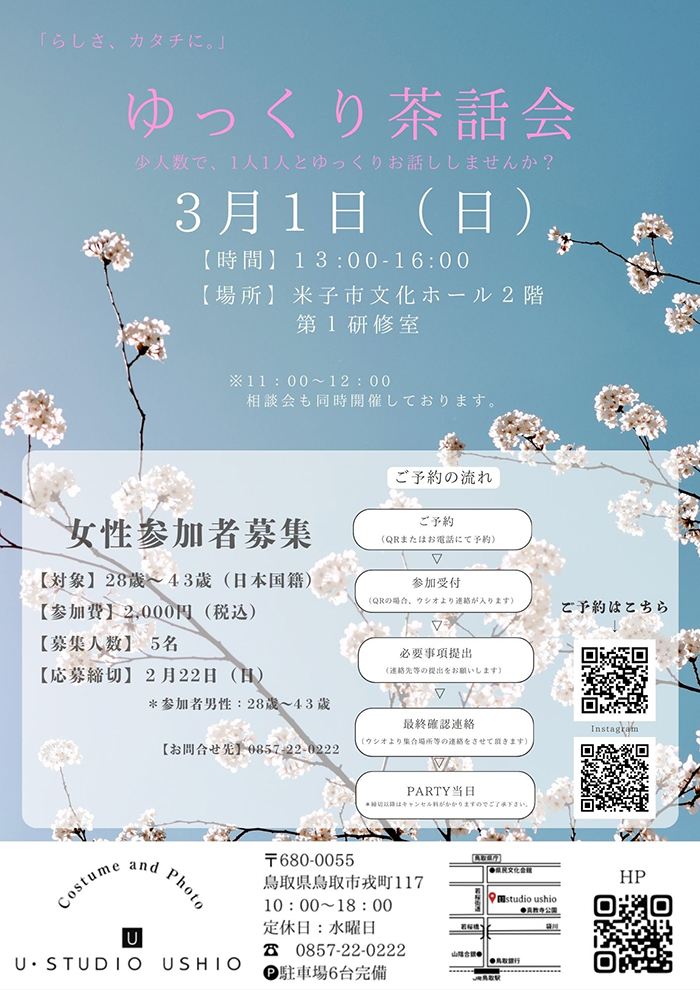 ゆっくり茶話会 – ![]() ※このイベントは、『Uスタジオウシオ』様の主催となります。 ゆっくり茶話会 開催日時: 会場: 参加費:2,000円 参加条件: 開催内容: 【主催】 【お問合せ】 |