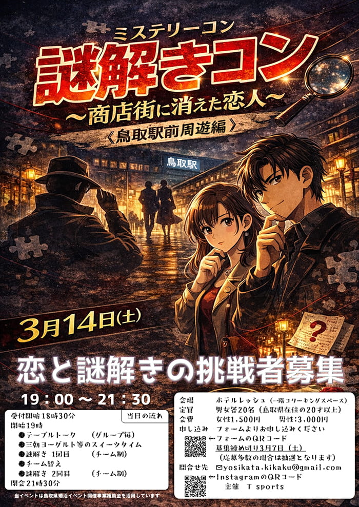 ミステリーコン 謎解きコン〜商店街に消えた恋人〜 – ![]() ※このイベントは、『T sports』様の主催となります。 ミステリーコン 主催:T sports 開催日時: 会場:ホテルレッシュ(鳥取駅前サンロード内) 参加条件: 開催内容: タイムテーブル: ※連絡先交換はスタッフを通しての予定です。 【主催】T sports |